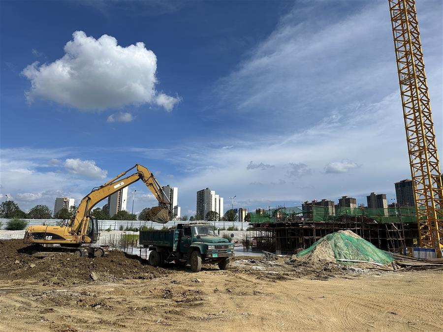 在農(nóng)投思賢幸福加項目,技術(shù)人員測繪、工人在綁扎鋼筋各作業(yè)面工作人員緊張忙碌地開展工作;施工機(jī)械運轉(zhuǎn)不停、運輸車輛來回穿梭,一派繁忙景象。