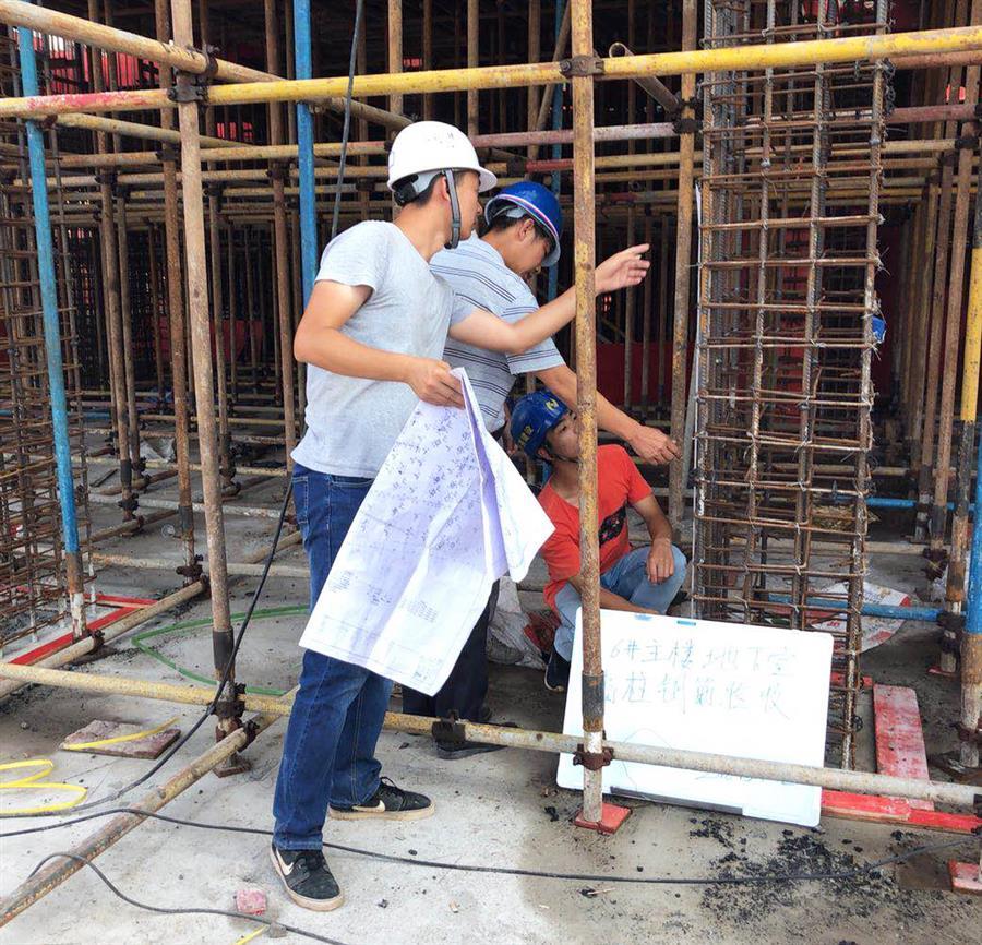 6月18日,在桂華分公司承建的梧州佛子時(shí)代廣場(chǎng)項(xiàng)目現(xiàn)場(chǎng),當(dāng)空烈日讓偌大的工地一片熾熱,焊花飛濺,工程車來(lái)來(lái)往往,工人們揮汗如雨。雖然施工作業(yè)已經(jīng)避開了高溫時(shí)段,但工人們?nèi)员缓顾粤搜劬?,濕了衣服。盡管這樣,大家仍堅(jiān)持“全副武裝”,手套、防護(hù)用具,安全帽,一樣都沒(méi)有少,自覺(jué)遵守安全文明施工相關(guān)規(guī)范。入行兩年的施工員趙俊財(cái)抹了一把汗說(shuō)道:“剛參加工作時(shí),不能和家人一起過(guò)節(jié)還挺難受的,后來(lái)把心態(tài)調(diào)整好了,想著只要家人安好,其實(shí)比什么都重要,趁著年輕,還是應(yīng)該多奮斗?!笨粗幻装舜髠€(gè)的他手拿圖紙和卷尺,蜷縮著身子,蹲在空間有限且熱得發(fā)燙的平臺(tái)上仔細(xì)檢查剛剛綁扎好的鋼筋籠,驕陽(yáng)烤得他黝黑的皮膚泛出一層水光,襯著那還略顯年輕的臉龐,顯得熠熠生輝。