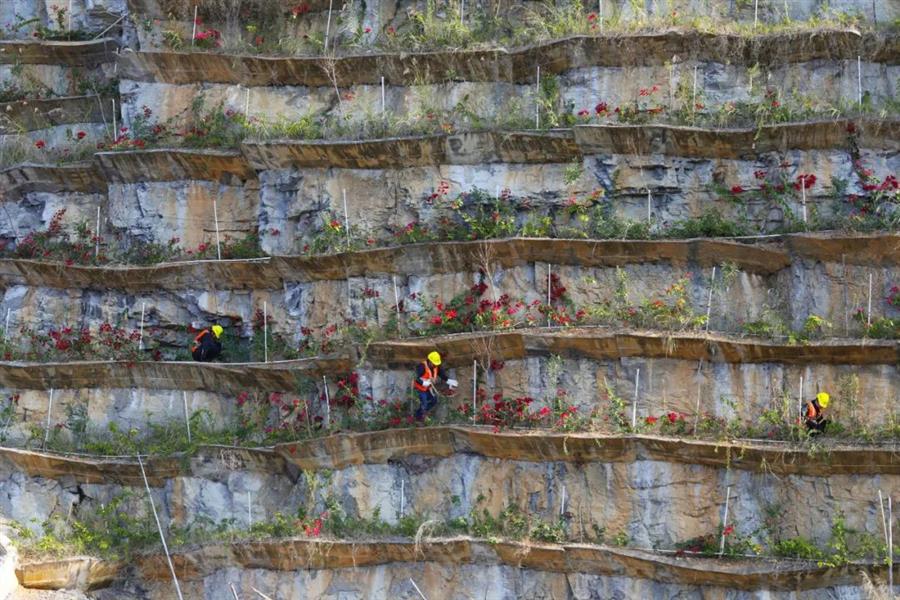 “我們已經(jīng)在山上種下了25萬多株各類苗木。”工程項(xiàng)目經(jīng)理陳超宇說,工人們需要先清理有滾落危險(xiǎn)的巖石,然后用鋼筋和混凝土在峭壁上搭建V型板槽,再給開辟出來的“梯田”回填泥土,并在“田間”鋪設(shè)噴淋系統(tǒng),最后才能進(jìn)行種植。目前種植的苗木有石山紫薇、夾竹桃、石山榕、爬山虎、三角梅、杜鵑等。