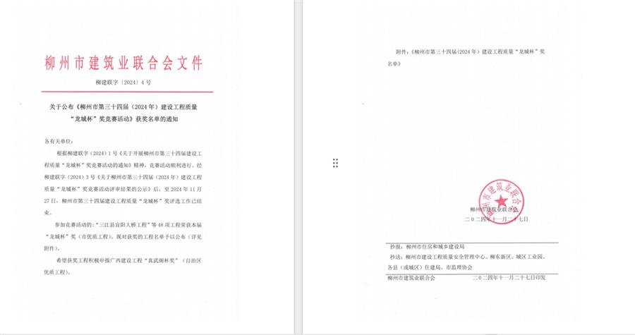 11月28日,柳州市建筑業(yè)聯(lián)合會公布柳州市第三十四屆(2024年)建設(shè)工程質(zhì)量“龍城杯獎”競賽活動獲獎名單和2024年柳州市建設(shè)工程優(yōu)質(zhì)結(jié)構(gòu)獎名單,由冶建公司承建的三江縣宜陽大橋工程等4項工程榮獲“龍城杯”獎;柳州市柳東新區(qū)明德小學項目(一期)等2項工程獲柳州市“優(yōu)質(zhì)結(jié)構(gòu)獎”。