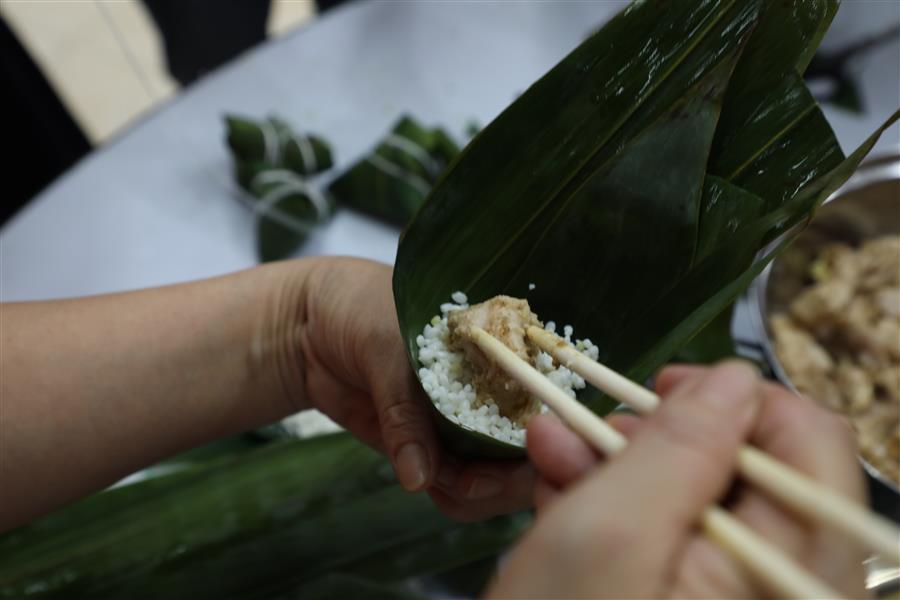 經(jīng)過簡單的現(xiàn)場教學(xué)后,大家領(lǐng)取材料,分組配合,踴躍參與包粽子比賽,只見大家捋粽葉、放餡、封口、扎捆,動(dòng)作一氣呵成,不一會(huì)兒,一只只各式各樣的粽子就在大家手中成型。